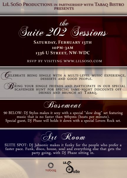One of my favorite persons,Risikat “Kat” Okedeyi and Lil SoSo Productions is hosting “The Suite 202 Sessions” on Saturday Kat is the mastermind of some of the best cultural and social events I have attended in DC such as Sunday Salon, Black President’s Celebration and When Harlem Came to Paris (March 20, 2010). And she is mad tight with the Soul Controllers, so her DJ arsenal is on lock. If you are single or have a “boo”, come get your groove on. You never know when cupid might strike! 😉