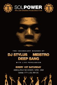 Also tonight is Sol Power! with DJs Stylus, Meistro & Deep Sang. This is one of my favorite events. This is where you are going to sweat. TRUST ME!