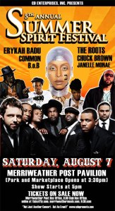 And unless you have been under rock, you know tomorrow is the 5th Annual Summer Spirit Festival. I have been going to this festival for the last two years, and I always have a great time. This year’s line-up is sure to please…E.Badu, J. Monae, Chuck Brown, The Roots & Common.