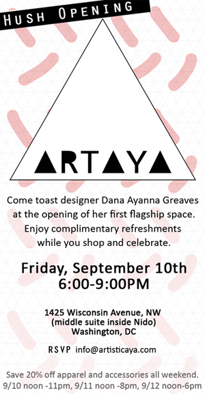 One of D.C.’s hottest local designers, Dana Greaves of Artisticaya is opening her first store in Georgetown. To celebrate, there is a sneak-peek party this Friday from 6-9pm.