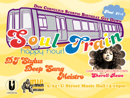 Celebrating the birthday of Don Cornelius DC style. Join the Sol Power All Stars: DJs Stylus, Deep Sang & Meistro for a soul train-filled happy hour.