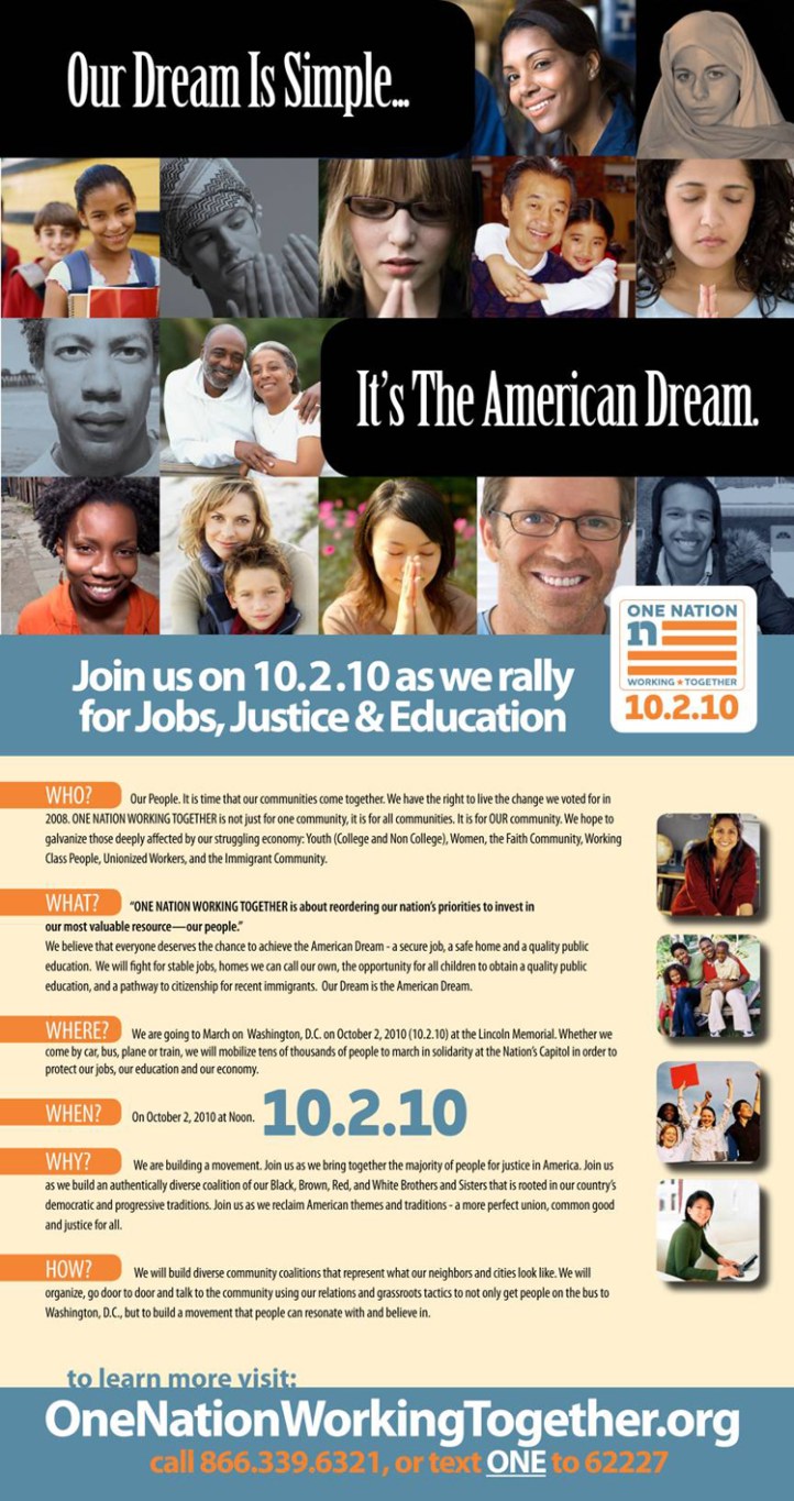 On Saturday, people from across America will gather to demonstrate their re-commitment to change. The One Nation March will feature human and civil rights leaders, labor leaders, environmental and peace activists, faith leaders, celebrities and sports figures – all marching together to help Put America Back to Work and to Pull America Back Together. And to help reorder our national priorities so that investments in people come first.