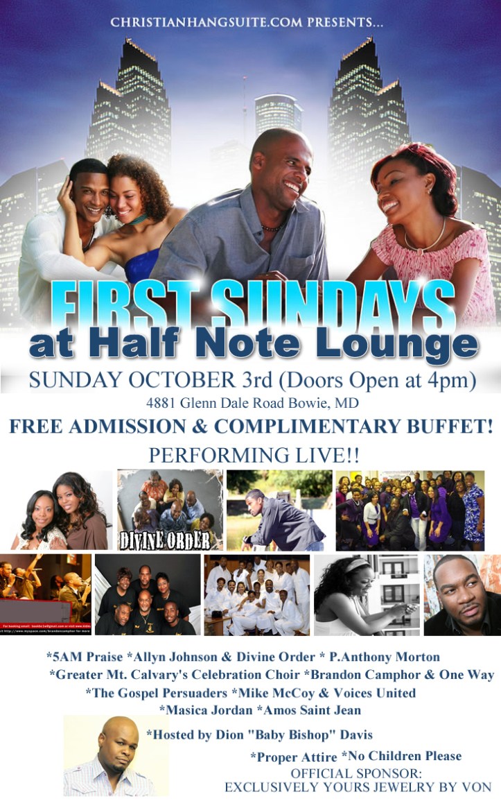 ChristianHangSuite.com celebrates The All NEW FIRST SUNDAYS at Half Note Lounge & Restaurant. Hosted by Dion “Baby Bishop” Davis! Performing LIVE! Brandon Camphor & One Way, 5am Praise, Greater Mt. Calvary’s Celebration Choir, Isaiah Thomas & EOP, Amos Saint Jean, Mike McCoy & Voices United, Allyn Johnson & Divine Order, Masica, The Gospel Persuaders, and P. Anthony Morton. Our Official Sponsor for the evening will be “EXCLUSIVELY YOURS” Jewelry by VON.