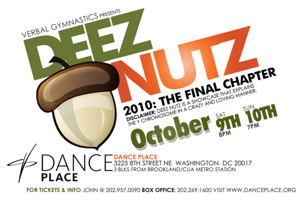 A male D.C. spin to the “Vagina Monologues”. This production addresses the many different issues that are associated with that Male (Y Chromosome). This production explores sex and relationships from the perspective of local men in the District of Columbia. The performers in “Deez Nutz 2010” creatively challenge the cultural norms that keep society stagnant through the use of poetry, music and heartfelt monologues.