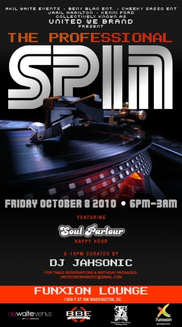 The Professional Spin was created as an escape from the usual club rigamarole. It is a place where music lovers, young professionals, taste-makers, and politicos that work hard can play hard. The evening includes Soul Parlour from 6p-10p. Soul Parlour seeks to let everyone live out their dream of being a DJ. Create a 10 song playlist on your MP3 player and DJ Jahsonic will handle the rest. It’s an opportunity to share your favorites and be introduced to the favorites of other like-minded individuals.