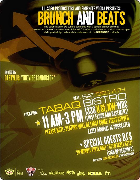 The celebration of DJ culture continues with a special Saturday brunch event!  Join Lil SoSo Productions for great music, food and SMIRNOFF cocktails. Hosted by DJ Stylus, “The Vibeconductor”, there will be a special guest DJs on the first floor and “open tables” in the basement. DJs can bring their vinyl and sign up to spin a 20-minute set.