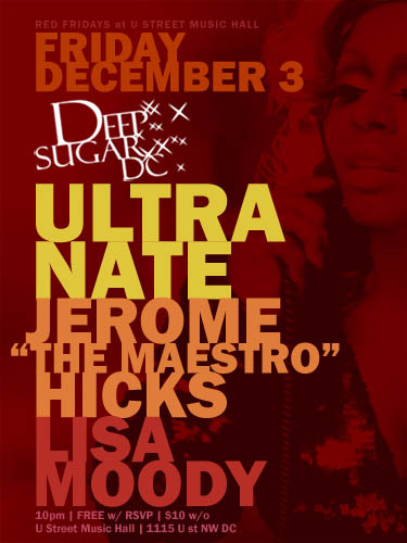 Deep Sugar comes to DC tonight!  Deep Sugar showcases Baltimore resident DJs, along with world-renowned guest DJs and performing artists.  Nearly five years ago, international dance music recording artist Ultra Nate’ and key friends, artists & DJs hailing from Baltimore made a commitment to give something back to the house scene and keep it thriving.  This is when they decided to start the Deep Sugar parties.  Taking place every 2nd Saturday of the month at The Paradox in Baltimore, folks come to sweat.
