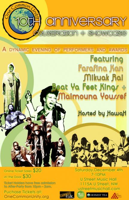This 10-year anniversary of One Common Unity is a celebration of epic proportions. A dynamic evening of musical and dance performances hosted by HawaH, and featuring Grammy nominated singer, emcee, and poet, Maimouna Youssef and the Beat Ya Feet Kings from MTV’s America’s Best Dance Crew.  Also headlining the bill is the West African drumming ensemble Farafina Kan and soul-singer/ songwriter Mikuak Rai.
