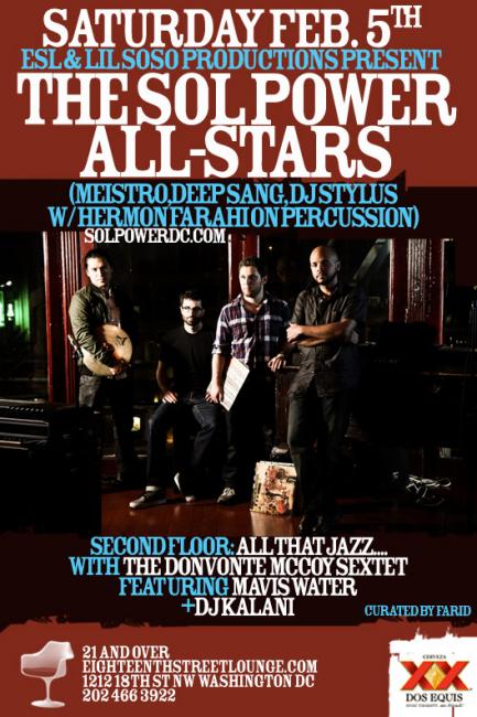 ESL & Lil SoSo Productions Present: The Sol Power-All Stars. After an extra month off due to the new year, their residency continues. From here on out, Sol Power will be there the first Saturdays every OTHER month.
