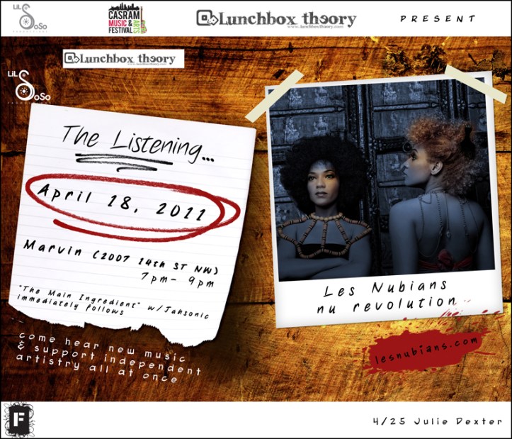 Join Lunchbox Theory at Marvin (14th & U St NW) TODAY (4/18) from 7-9PM to hang out with the wonderful ladies of Les Nubians and hear their new project before it hits stores.
