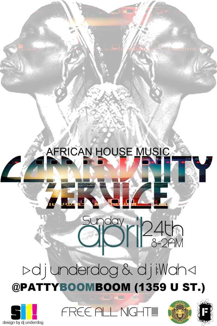Community Service w/ DJ Underdog & i:Wah, the music is an uplifting torrent of new “House”, mixed in with a more than generous serving of Soulful House, Afrobeat, Electronic Dance, Coupe Decale, Samba, Zouk, Disco, Fete, JuJu, Fania, Afro Drumming and much more. Filling the groove and moving you into the dance.