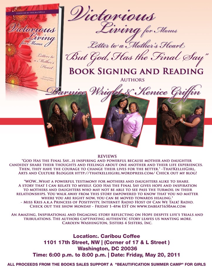 The Victorious Living for Moms book, Letters to a Mother’s Heart – Chapter “But God, Has the Final Say” Book Signing and Reading.   Authors Darnice Wright and Kenice Griffin of WrightVision Foundation.   ALL PROCEEDS FROM THE BOOKS SALES SUPPORT A “BEAUTIFICATION SUMMER CAMP” FOR GIRLS