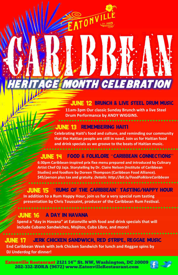 Eatonville’s monthly dinner series, Food & Folklore, highlights “Caribbean Connections” with a special prix fixe menu prepared and introduced by guest chef, Culinary Artist Chef Oji Ashebre Jaja, of Kingston, Jamaica . “Caribbean Connections” Food & Folklore is part of Eatonville’s culinary celebration for Caribbean Heritage Month.