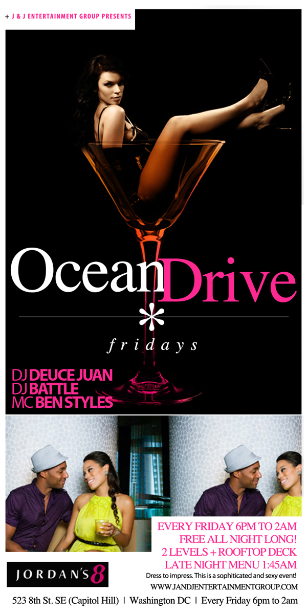 J & J Entertainment Group presents….Ocean Drive Fridays at Jordan’s 8. DJ Deuce Juan & DJ Battle on the 1 and 2’s and hosted by BenStyles. Two Levels + Rooftop Deck, Premium Drink Specials, Fly & Sexy Decor, Multiple Plasma TVs on both levels, Great Dinner Menu. Late night menu till 1:00am