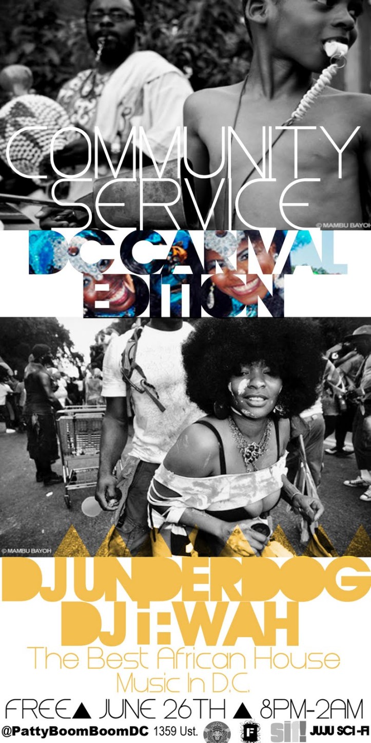 On Sunday, i;Wah & DJ Underdog return to PattyBOOMBoom for a special Carnival edition of Community Service: the AfroFuturistic House Party.
