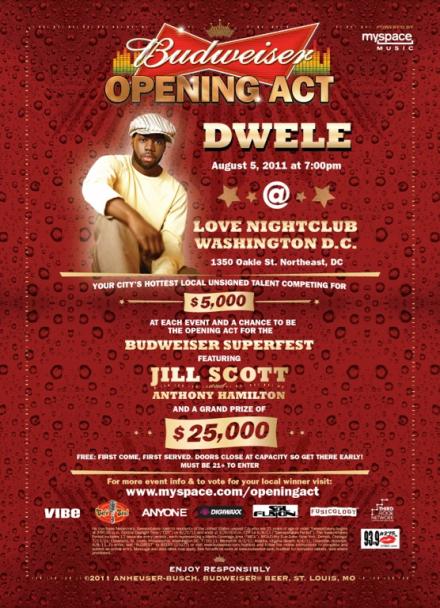 See Dwele live along with your hottest unsigned local singers. The Budweiser Myspace Opening Act tour hosts a night of live music with Dwele as they decide who will be the D.C. Opening Act winner. Be there to see DC’s top 10 finalists take the stage to compete for a cash prize of $5,000 and the opening act spot for the 2011 Budweiser Super Fest Jill Scott Block Party. Early arrival is strongly suggested.