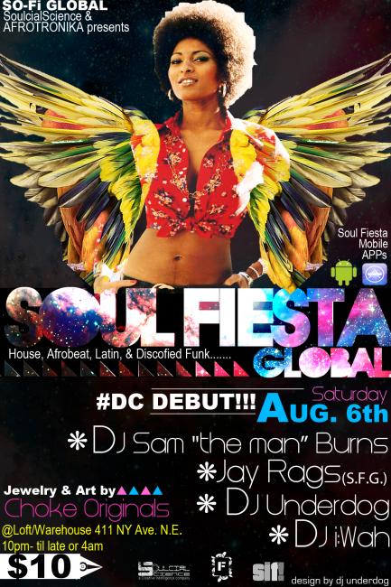 Sol Fiesta Global started in 2003 with many global soul dj’s including Karizma, DJ Oji, Josh from Blaze, Ian Friday and more. Sol Fiesta Global is proud to have an opportunity to bring you sexy dancers and social butterflies a festive night with some of the best dance music around. In the house will be DJs Jay Rags, with the capital city House music ambassador Sam “The Man” Burns. Special guests “JuJu Sci-Fi”(DJ’s Iwah & Underdog).