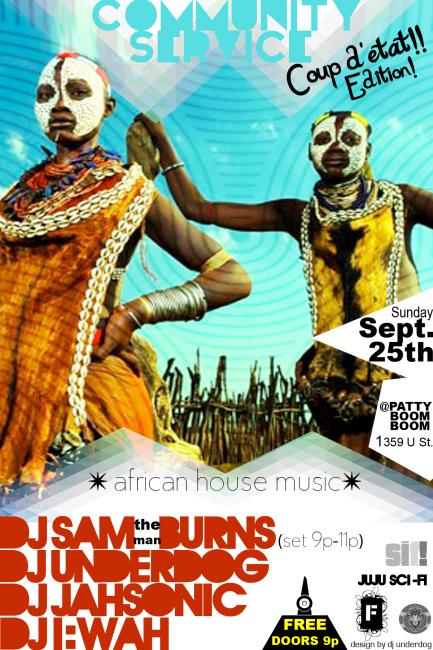 This special edition of Community Service will feature DC’s top house heavy hitter djs inclusive of Sam “the man” Burns, Jahsonic, Dj Underdog and DJ I:Wah… Be there!!