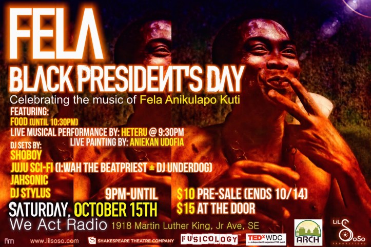 “Black President’s Day” will feature food, live music, live art and more! Each year LSP and its partners pay tribute to the creator of Afrobeat music, Fela Anikulapo-Kuti. For one night attendees are invited into our version of the shrine, and experience the best of Fela and music he has inspired.This year we are excited to bring Fela to historic Anacostia, a fitting location for such an important tribute.