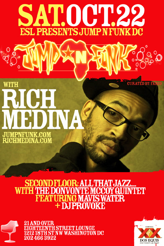 October, 2011 marks JUMP N FUNK’s 10th Anniversary, and we are proud to announce that we have tour dates in New York, Atlanta, Los Angeles, Miami, St. Louis, Washington, DC, and Philadelphia to celebrate with our extended Afrobeat Family nationwide. JUMP N FUNK, America’s Original Afrobeat Party, was born of the collective vision and efforts of Rich Medina, Debbie Sealy and Trevor Schoonmaker in late-summer, 2001.