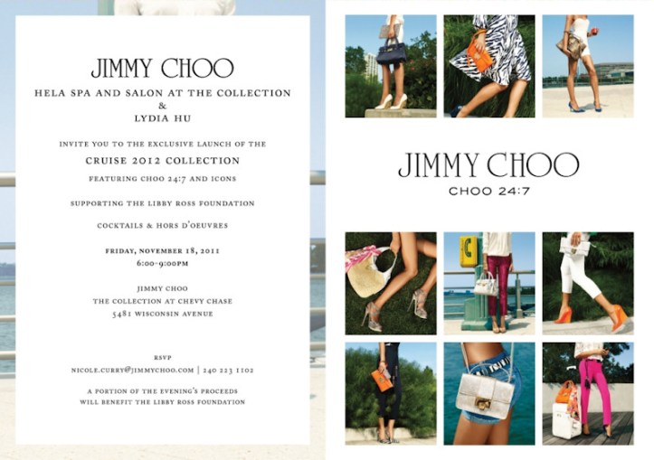 Jimmy Choo and Hela Salon & Spa at The Collection present the launch of the Cruise 2012 Collection, featuring CHOO 24:7 and Icons. Enjoy an evening of cute couture and classy cocktails with Jimmy Choo and Hela Salon & Spa hosted by the lovely and talented Miss Sinergy 2012 crown-holder Lydia Hu.  A portion of the proceeds will benefit The Libby Ross Foundation.