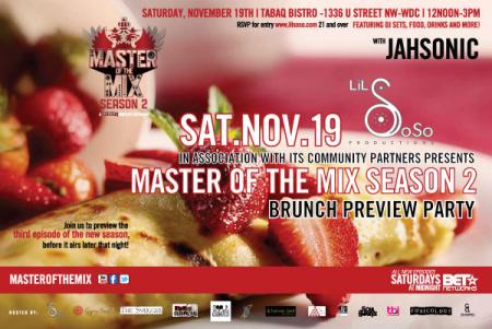 LiL SoSo Productions presents Master of The Mix Season 2 Brunch Preview Party.  Join us to preview the 3rd episode of the new season before it airs later that night!  Featuring DJ Sets, Food, Drinks and more!