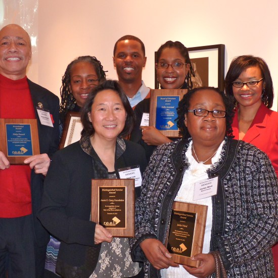 - r.e.e.l. Board Members Jeanine Hunter, Charles Wilson, Regan Ford, and East of the River Honoree Annie E. Casey Foundation represented by Irene Lee