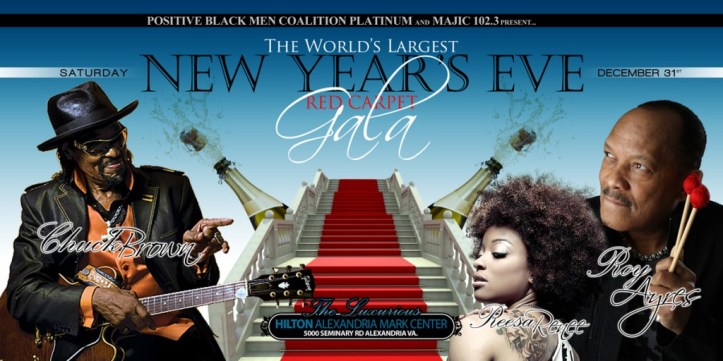 Join the Positive Black Men Coalition for their New Years Eve Gala! There will be 3 Ballrooms of entertainment, Soul food buffet, Midnight Champagne Toast, live broadcast and more! Hosted by Majic 102.3. Featuring Roy Ayers! Also performing live Chuck Brown, Reesa Renee, Secret Society, and Soul Patrol.