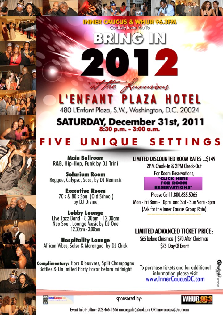 Every year Inner Caucus & WHUR have been presenting you the best and most diverse New Year’s Eve Party in DC. This elegant event attracts equal numbers of singles and couples alike. You are invited to join us again as we continue our annual new year’s eve celebration gala. You are welcome to invite friends and family.