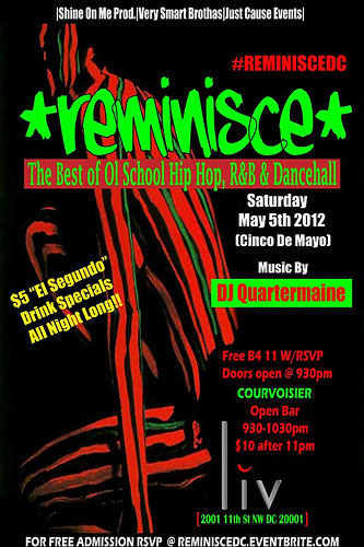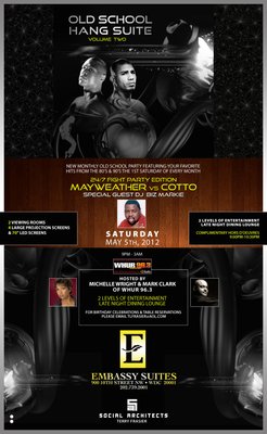 Biz Markie spinning classic songs in the main ballroom and DJ Quicksilver dropping ’80s and ’90s house and reggae in the “Hang Suite”. WHUR (96.3 FM) DJs Michele Wright and Mark Clarke host. Both party areas feature drink specials, hors d’oeuvres and projection TVs screening the Floyd Mayweather Jr.-Miguel Cotto fight.