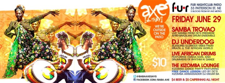 Axe’(ah-SHAY) is partying outdoors this month. Come Party the night away to a glorious fusion of music and dance