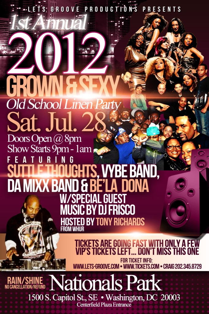 If you’re ready for the hottest party of the summer, then get your tickets to the 1st Annual 2012 Grown & Sexy Old School Linen Party at Nationals Park! Experience the hottest bands in the DMV featuring Suttle Thoughts, Vybe, DaMixx Band and Be’La Dona.