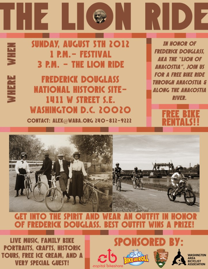 Washington Area Bicyclist Association (WABA) is hosting its inaugural “The Lion Ride” biking event in honor of civil rights advocate and former Anacostia resident Frederick Douglass. The event is in partnership with the Frederick Douglass National Historic Site, Capital Bikeshare, and Bike & Roll. The ride will be a part of the Fifth Annual Frederick Douglass Family Festival sponsored by the Frederick Douglass National Historic Site. Attendees can expect free ice cream, music, games, crafts, bicycle portraits, historic house tours, Massachusetts 54th re-enactors, and a Frederick Douglass impersonator. No bike, no problem. Bike and helmets will be loaned out on a first come, first served basis.