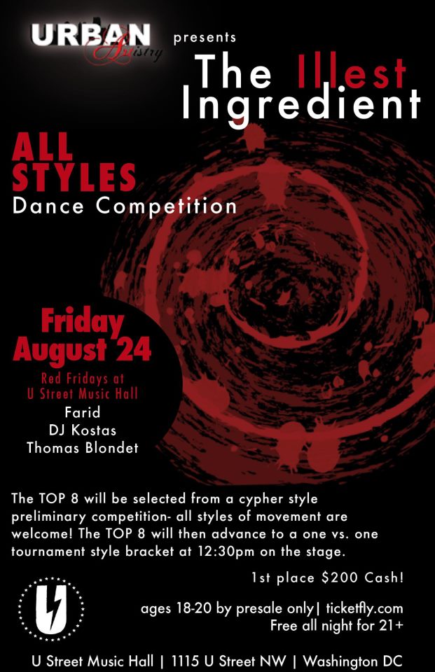 10PM registration begins for The Illest Ingredient All-Styles Dance Competition.12AM the TOP 8 dancers will be chosen to advance from a cypher style PRELIM to compete in a single-elimination tournament style bracket at 1:00am.1st place $200 Cash!