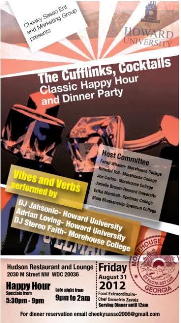 Cufflinks, Cocktails and Classic Happy Hour and Dinner Party with Vibes and Verbs performed by DJ Jahsonic (Howard University), Adrian Loving (Howard University) and DJ Stereo Faith (Morehouse College).
