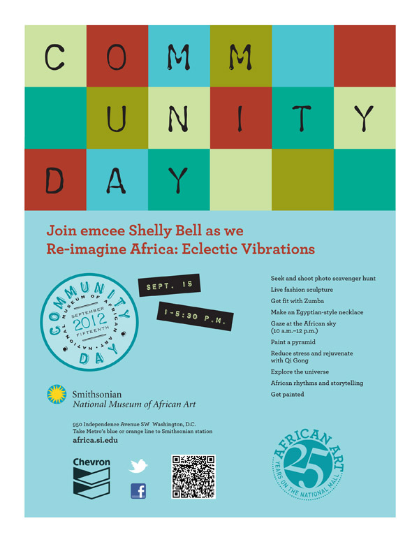 The National Museum of African Art’s Annual Community Day is Saturday. This year’s theme is “Re-imagine Africa: Eclectic Vibrations.” Each September, the museum opens its doors so visitors of all ages may experience special performances and events intended to inspire them to learn more about the people and cultures of Africa and its diaspora through music, dance, film and art.