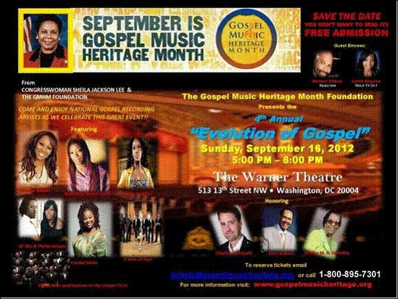 Co-Sponsored by Congresswoman Sheila Jackson Lee, the Congressional Black Caucus, and the Gospel Music Heritage Foundation, “Evolution of Gospel” celebrates Gospel Music Heritage Month (September) with a star-studded, foot-stomping event that tells the story of Gospel music through narration and song, beginning at the Middle Passage and winding up with highlights of contemporary Gospel music. Come out and praise the Lord as we honor Gospel Music Channel founder, Charley Humbard, Stellar Awards producer, Don Jackson, and DC’s own Gospel music icon, Mrs. Shirley M.K. Berkeley. Featured artists include Yolanda Adams, Maurette Brown-Clark, Damita Haddon, Lil’ Mo and Phillip Bryant, Crystal Akins, The 7 Sons of Soul, the Washington Performing Arts Society Men and Women of the Gospel Choir, and more.