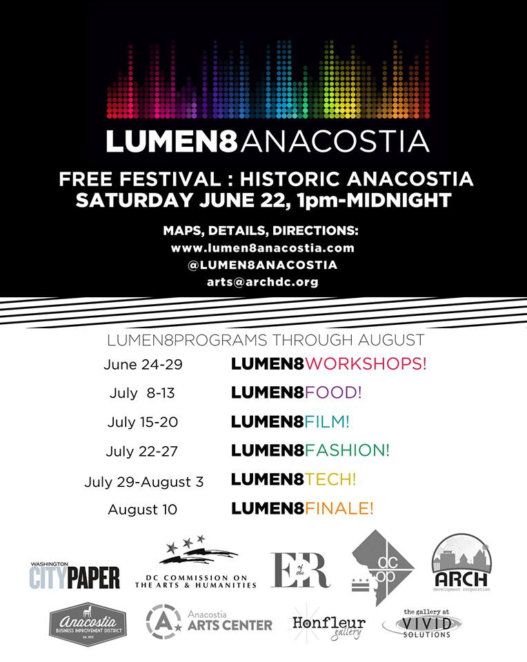 LUMEN8Anacostia returns on June 22! The all-day kickoff festival marks the start of LUMEN8 programming that will run through August 10. From 1-6 p.m., there will be children’s activities, interactive exhibits, performances and more! Then, from 6 p.m. – midnight, the old police evidence warehouse at 2235 Shannon Pl. SE transforms into The Music Box. Along with performances by six local bands, The Music Box will also have live wet plate and large format portrait sessions by STRATA photo collective, a Busboys & Poets pop-up restaurant, and a cash bar.
