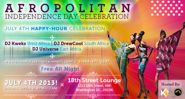 DrumPulse Entertainment & Kali TV present “Afropolitan Independence Day Celebration” – A special afropolitan July 4th extended happy-hour treat for DMV professionals. Top DJs from West, East and South Africa will be giving you an unforgettable experience. This will be a true all Africa celebration with the best music hits from the West, the East and the South. You simply can not miss this special edition.